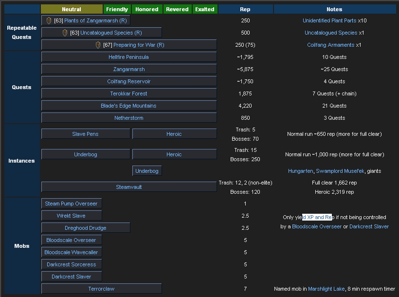 .....- Opakovatelny quest umoznujici dosahnout honored reputace bez plneni normalnich questu. Temer ze vsech potvurek v Zangarmarsh padaji specialni kousky rostlin, ktere po 10kusech muzete menit za 250 reputace. Navic pokazde dostane pytlik bylinek, ktere muzete dal vyuzit. Po dosazeni honored quest ztraci opakovatelnost a nelze jiz znovu zadat.