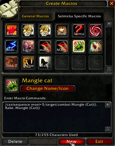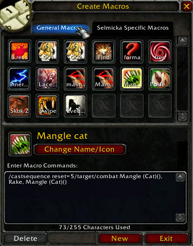 Projede postupne celou sequenci castu Mangle (Cat)(), Rake, Mangle (Cat)(), pricemz prikaz reset=5/target/combat udela: pri 5s nepouziti makro resetuje (spousti od zacatku), to same se stane pri zmene targetu, a pokud se zmeni combat